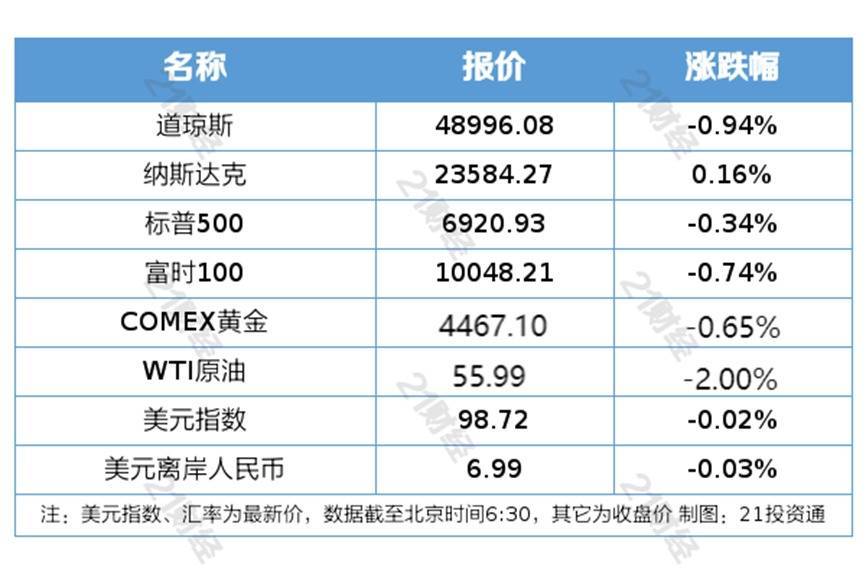 纽约股市三大股指1月7日涨跌不一。截至当天收盘,道琼斯工业平均指数比前一交易日下跌466.00点,收于48996.08点,跌幅为0.94%;标准普尔500种股票指数下跌23.89点,收于6920.93点,跌幅为0.34%;纳斯达克综合指数上涨37.10点,收于23584.28点,涨幅为0.16%。
